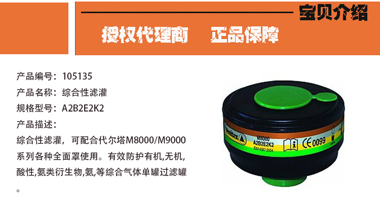 描述:综合性滤灌,可配合代尔塔M8000/M9000系列各种全面罩使用。有效防护有机,无机,酸性,氨类衍生物,氨,等综合气体单罐过滤罐