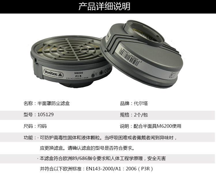 半面罩防尘滤盒,2个装,防有毒固体粉尘、液态气溶胶,可长时间提供保护。