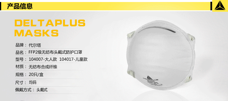 描述:无纺布防护口罩,FFP2等级(同时通过N95认证),过滤效率94%以上,带泡沫垫可调节鼻夹,佩戴舒适,每盒20只装。另有型号M1200,大尺寸供选