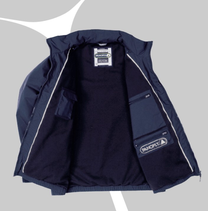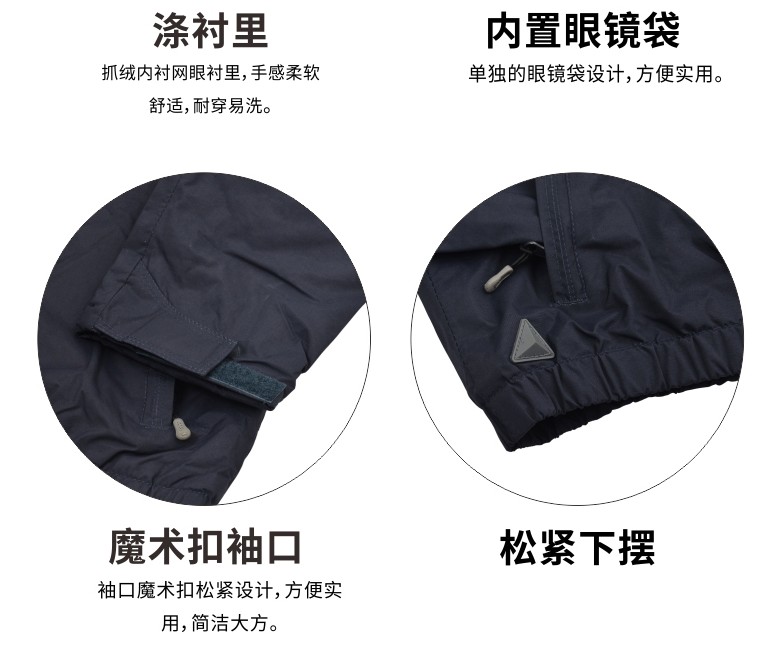 说明:时尚款冲锋衣,Taslon聚酰胺面料,防水接缝,涤衬 里,腋下猫眼透气设计,袖子部分涤填充衬里,松紧下 摆,穿着舒适轻便。 颜色:BM-藏青色